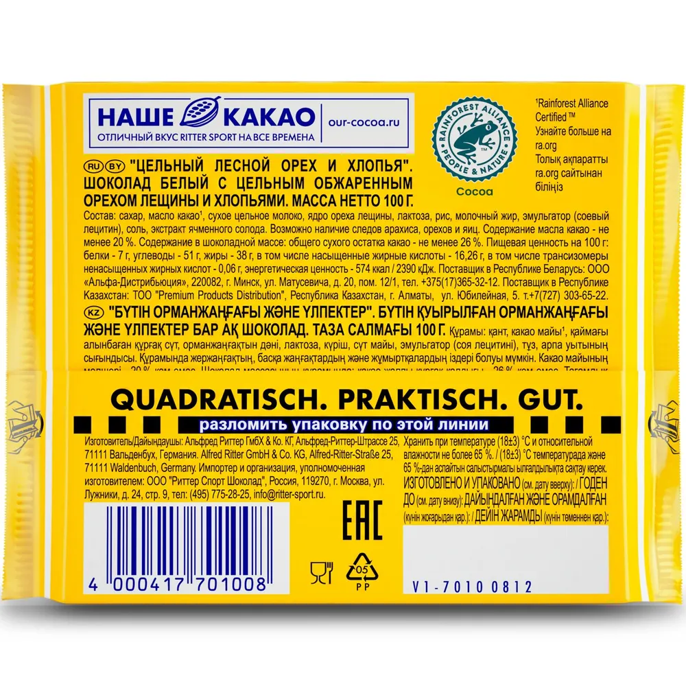 СохранитьШоколад белый Ritter Sport (Риттер Спорт) Цельный лесной орех и хлопья 100 г интересное: