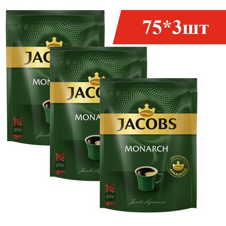 Кофе растворимый JACOBS Monarch, комплект 3 шт., сублимированный, 210г, мягкая упаковка, ш/к 70411, 8052808