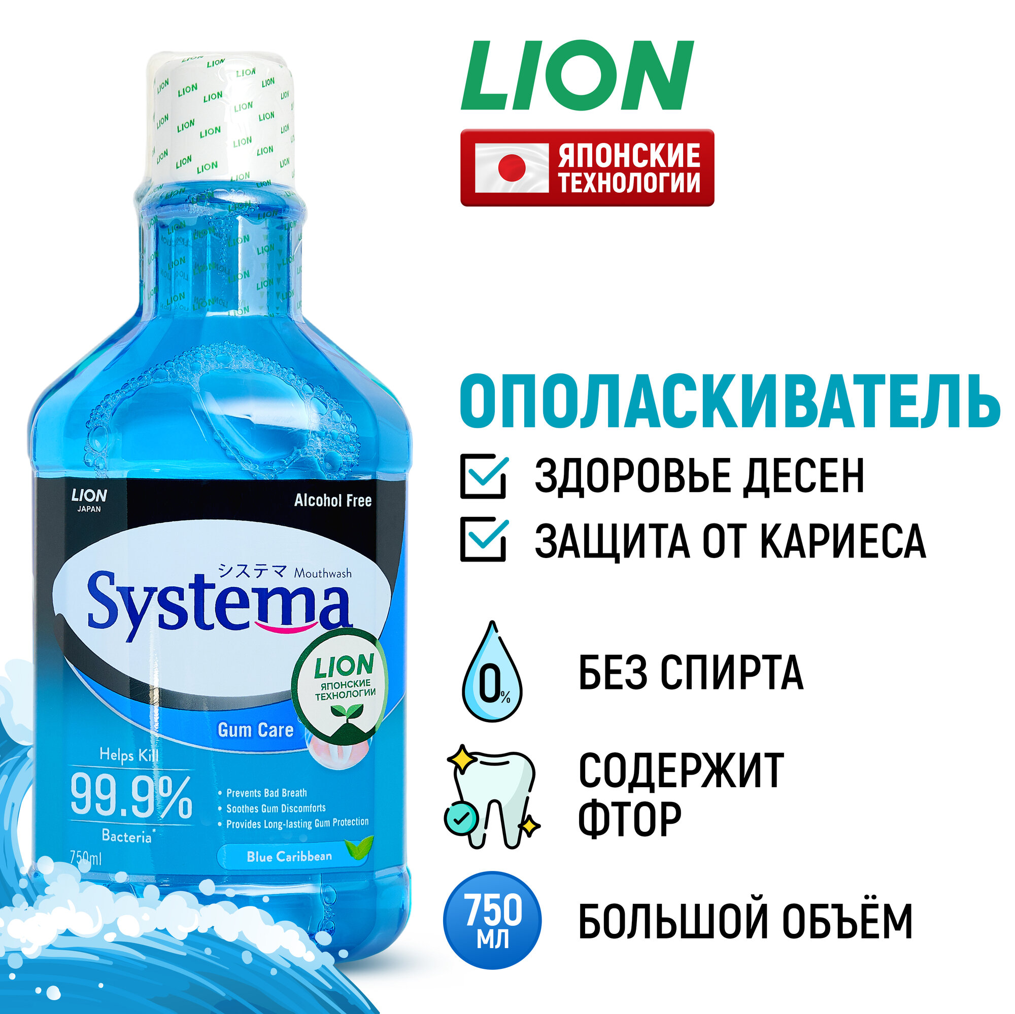 LION Ополаскиватель для полости рта Systema "Морской бриз" с фтором и ксилитом / Жидкость для полоскания, средство для зубов и десен / Защита от зубного налета и кариеса, 750 мл