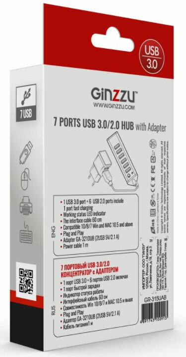 HUB GR-315UAB Ginzzu USB 3.0/2.0, 7 port(1xUSB3.0+6xUSB2.0)+adp