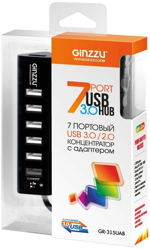 Разветвитель USB 3.0 Ginzzu GR-315UAB 7 портов (1xUSB3.0+6xUSB2.0)+adp