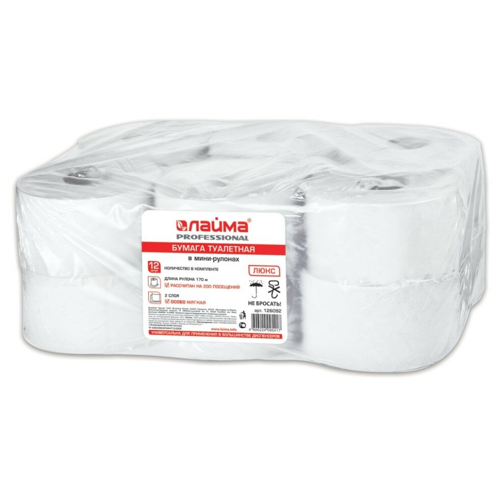 Туалетная бумага лайма 170 м, комплект 12 шт., люкс, 2-х слойная, белая, 126092