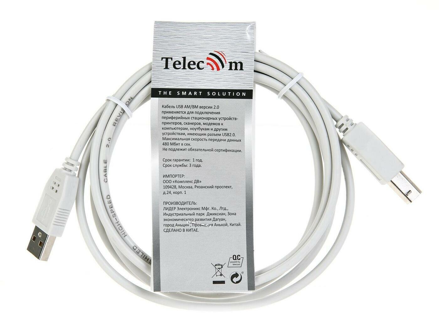 TELECOM Кабель (TC6900-1.8M) USB2.0 A-->B 1.8м [6926123461853]