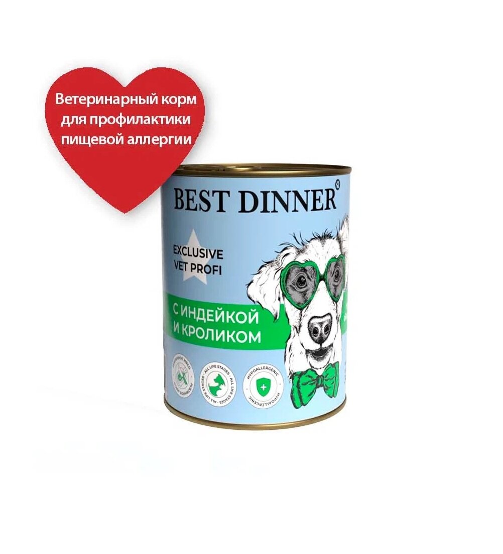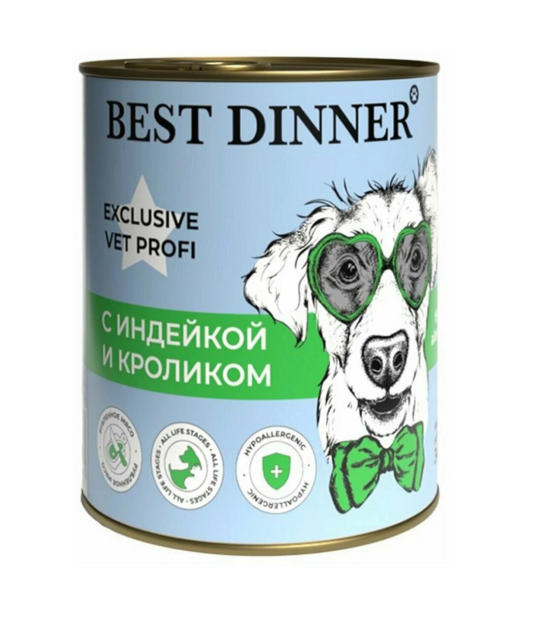 BEST DINNER EXCLUSIVE VET PROFI HYPOALLERGENIC для собак и щенков при пищевой аллергии с индейкой и кроликом (340 гр х 12 шт)