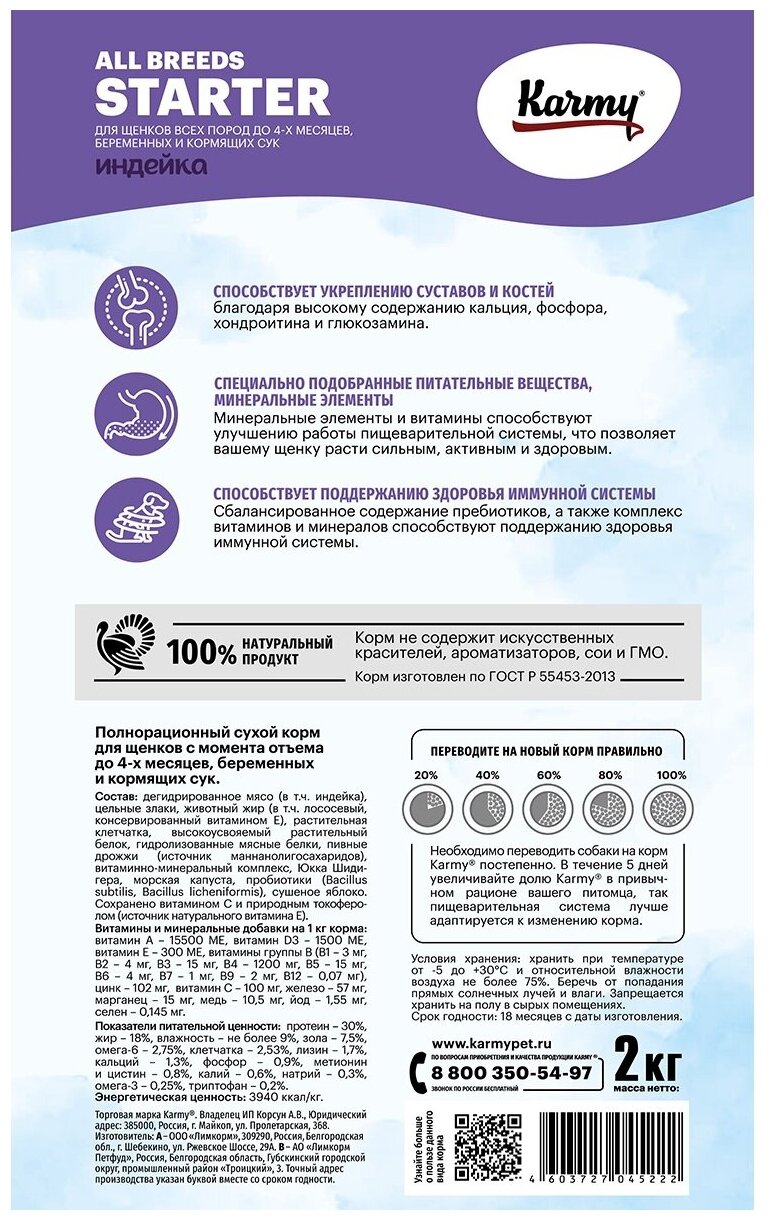 KARMY STARTER ALL BREEDS для щенков всех пород до 4 месяцев, беременных и кормящих сук с индейкой (2 + 2 кг)