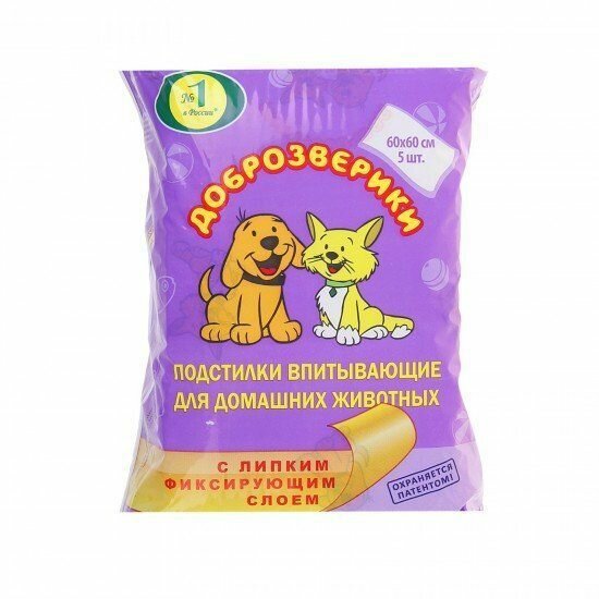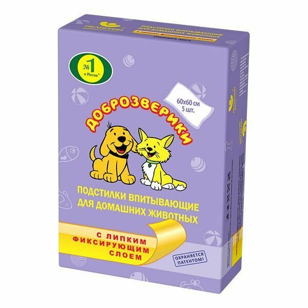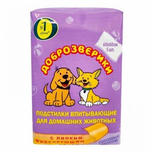 Пелигрин Доброзверики Подстилки впитывающие д/домашних животных с липким фиксирующим слоем 60*60*5шт .