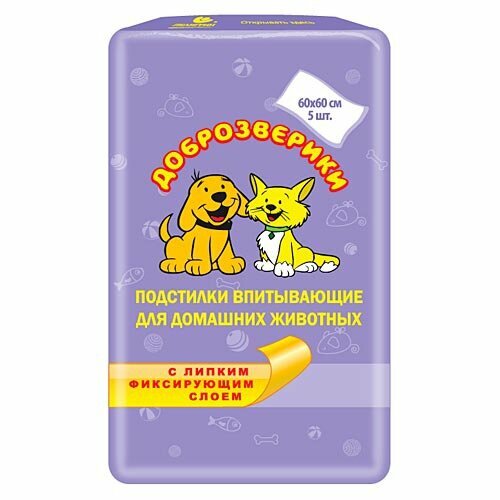 Пелигрин Подстилки впитывающие для домашних животных Доброзверики с липким фиксирующим слоем, 5шт