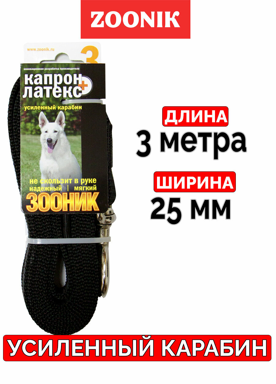 Поводок для собак 25 мм Зооник капроновый с двойной латексной нитью и усиленным карабином черный 3 м (1 шт)