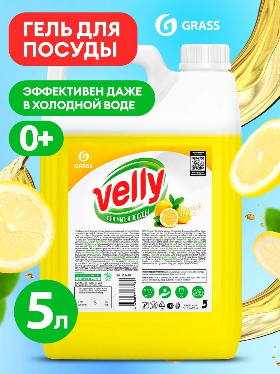 Grass Средство для мытья посуды Velly лимон универсальное моющее гель для кухни 5 литров