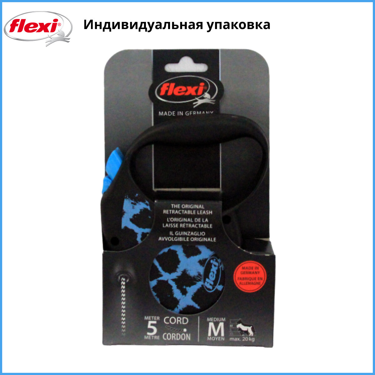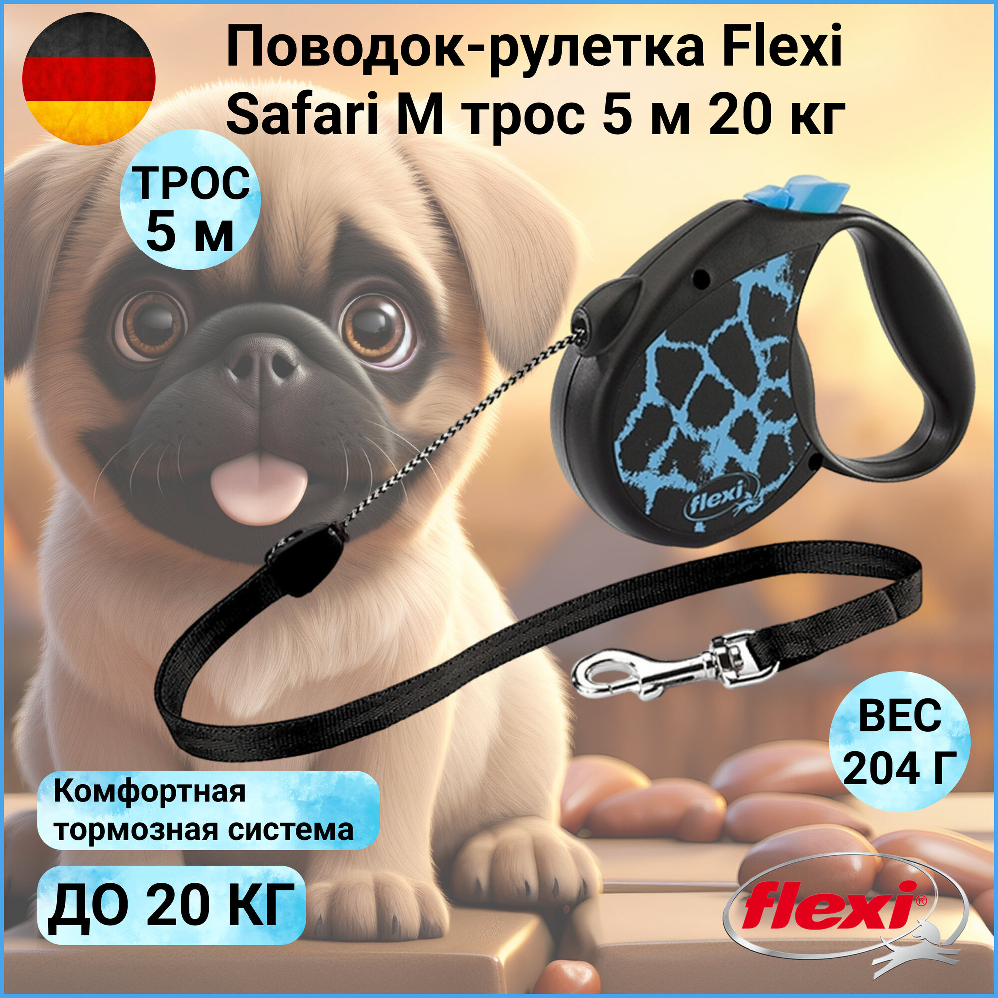 FLEXI SAFARI CORD тросовый поводок-рулетка для животных 5 м размер M голубой жираф (1 шт)