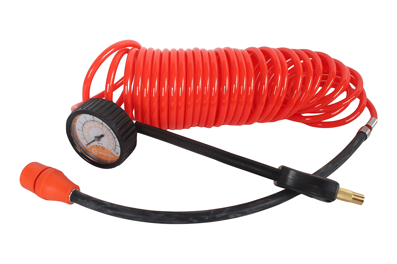 Длинный шланг и время работы позволяет один раз подключить компрессор и без лишних движений накачать все колёса. Манометр достаточно точный (сзади кнопка для сброса давления в шланге чтобы посмотреть сколько уже накачано) |
