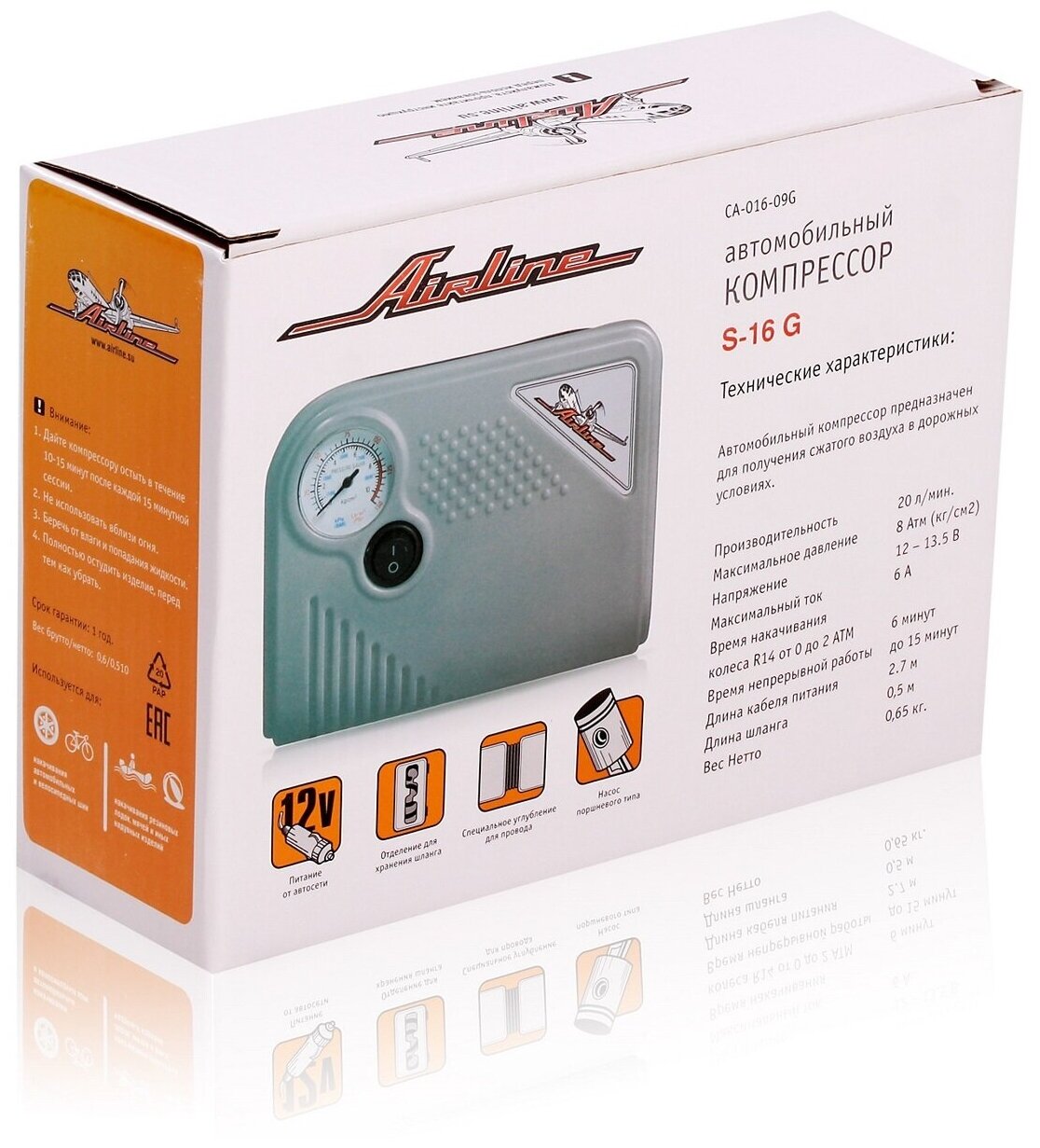 Автомобильный компрессор Airline S-16 G пластиковый корпус (20л/мин, 8 АТМ) CA01609G