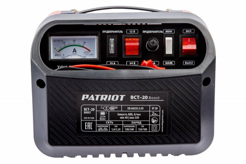 PATRIOT Батареи аккумуляторные и Зарядные устройства Заряднопредпусковое устройство PATRIOT BCT-20 Boost 650301520 Вход.напр. 1ф - 220В ±15%, макс.мощн. 450Вт; напр.зарядки 12/24В, ток заряд/boost 12.0/16.0А; емк.бат. 90-180А/час, вес 6.7кг