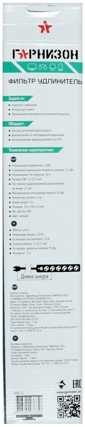 Сетевой фильтр Гарнизон ЕНB-15 black (5.0 м, 6 розеток) (EHB-15) Без ограничений