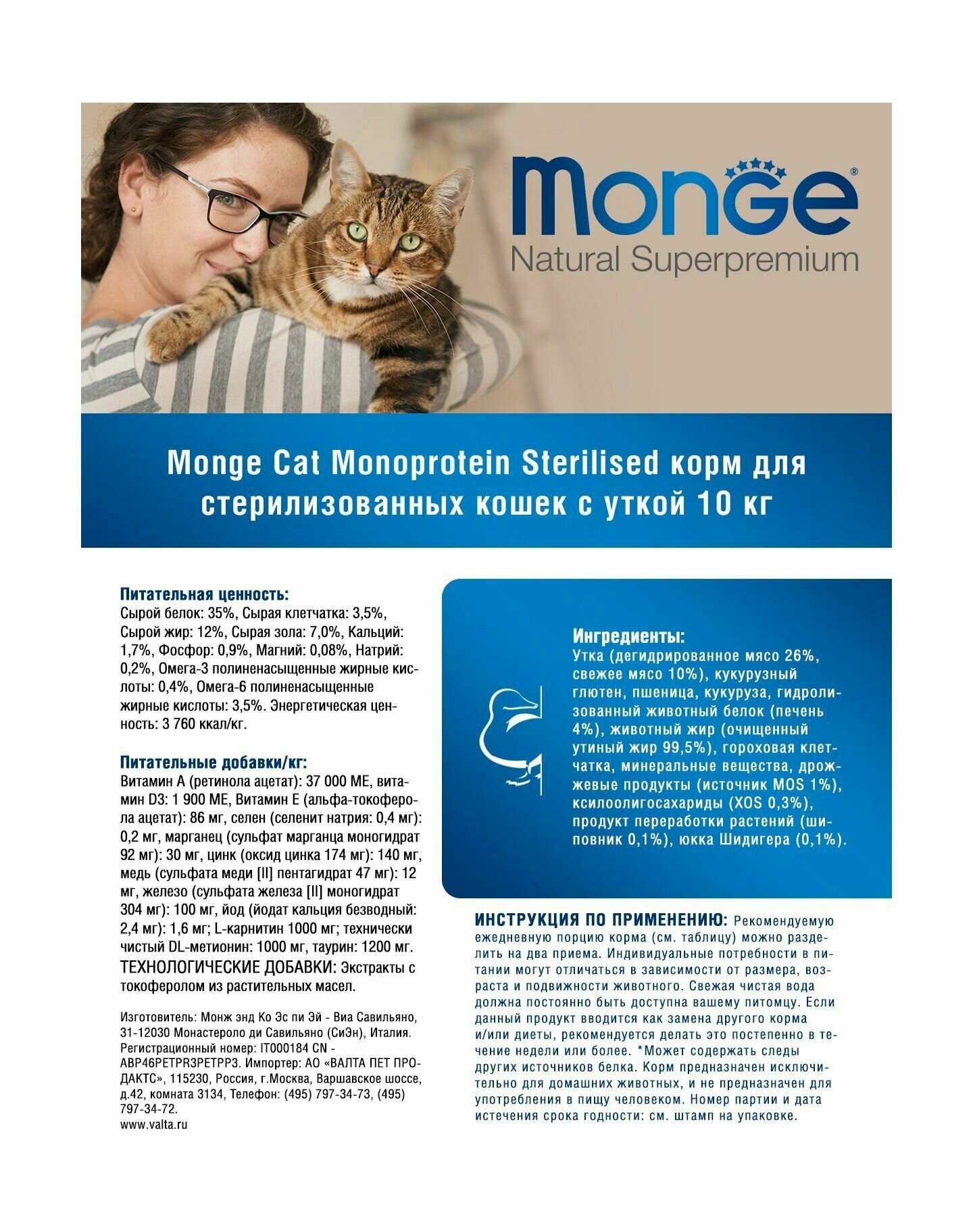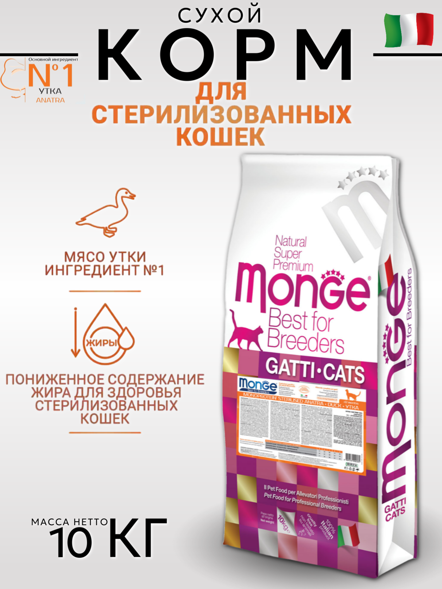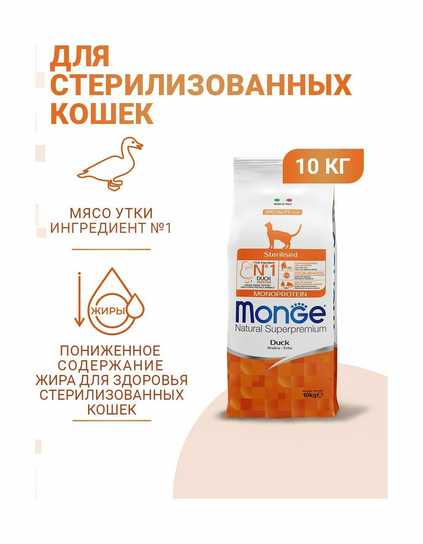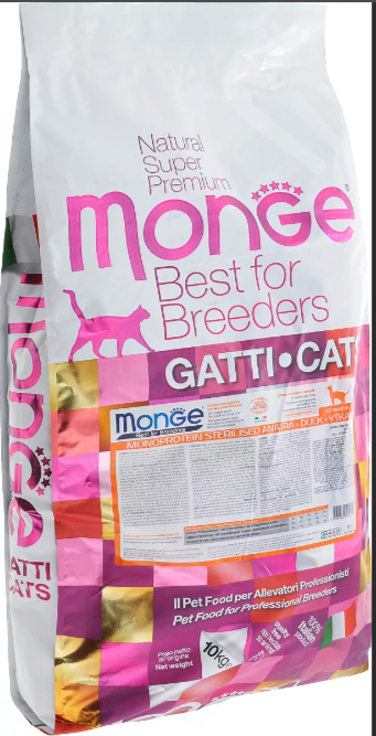 Monge Cat Monoprotein корм для стерилизованных взрослых кошек всех пород, утка 10 кг