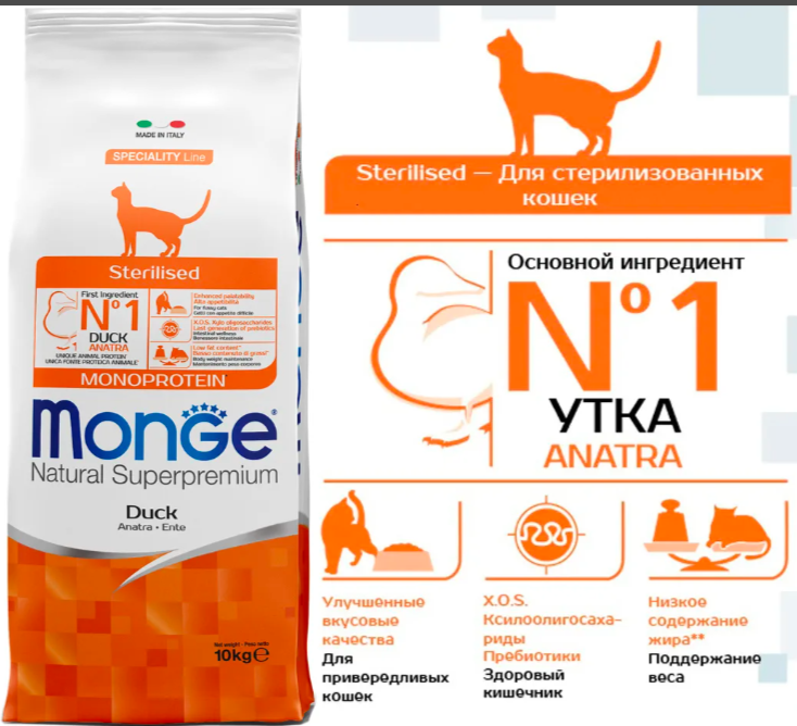 Ниже Вы можете прочитать отзывы на Monge Natural Superpremium Monoprotein,для стеризованных кошек с уткой 10 кг, ознакомится с подробными характеристиками, посмотреть интересные обзоры и фотографии на Monge Natural Superpremium Monoprotein,для стеризованных кошек с уткой 10 кг.