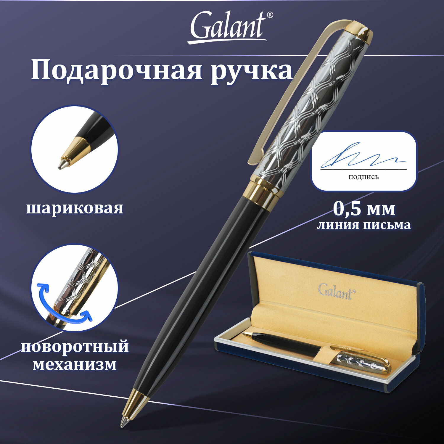 Ручка шариковая подарочная Galant "Consul", серебристый с черным, золотистые детали, 0,7 мм, синяя (140963)