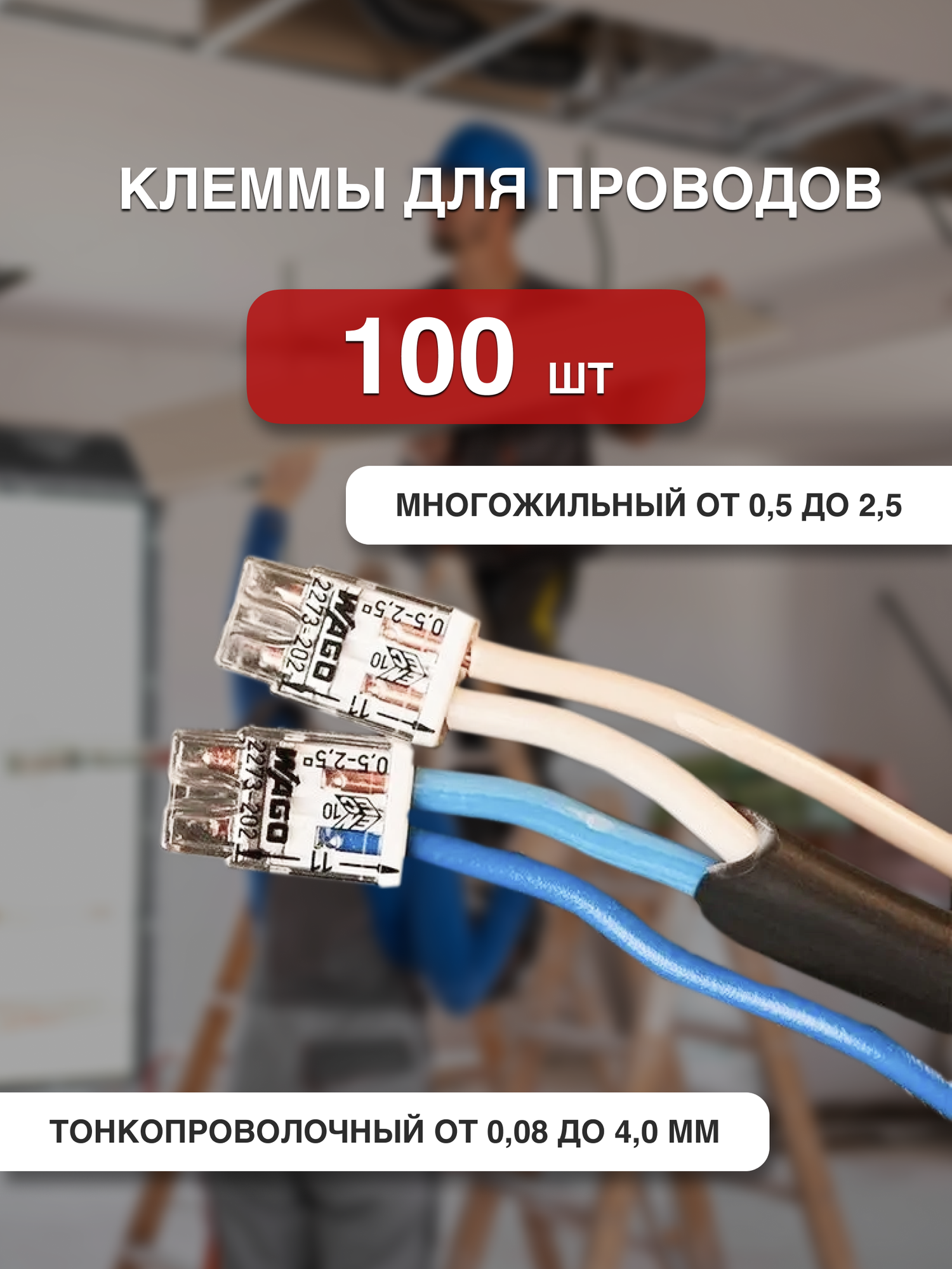 Клемма ваго 100 шт(одножильных) х 0,5-2,5 мм2 24A Cu соединительная для проводов двойная 2273-202 Ваго клеммник
