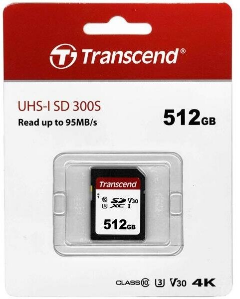 Карта памяти SDXC UHS-I U3 Transcend 512 ГБ, 100 МБ/с, Class 10, TS512GSDC300S, 1 шт., без адаптера