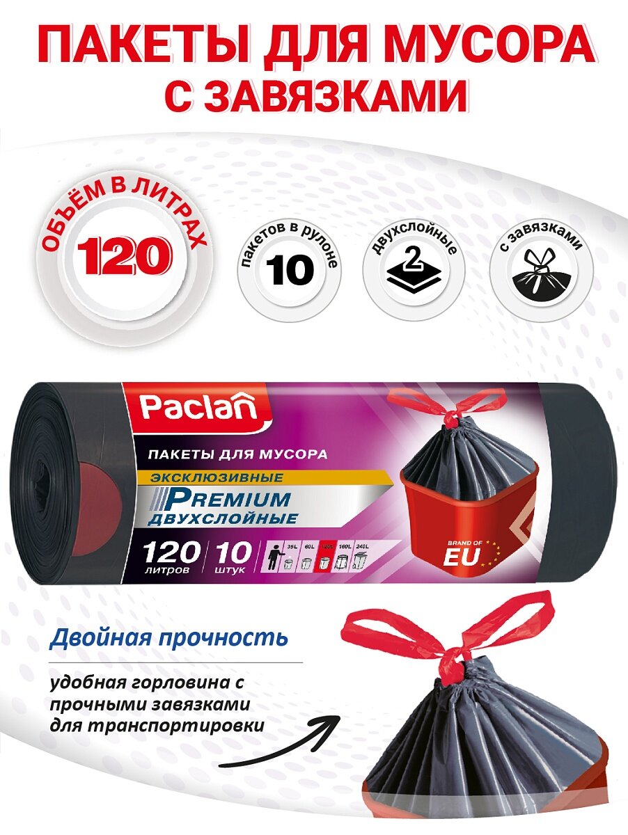 PACLAN PREMIUM Мешки для мусора с тесьмой 120 л, 10 шт. (ПВД)