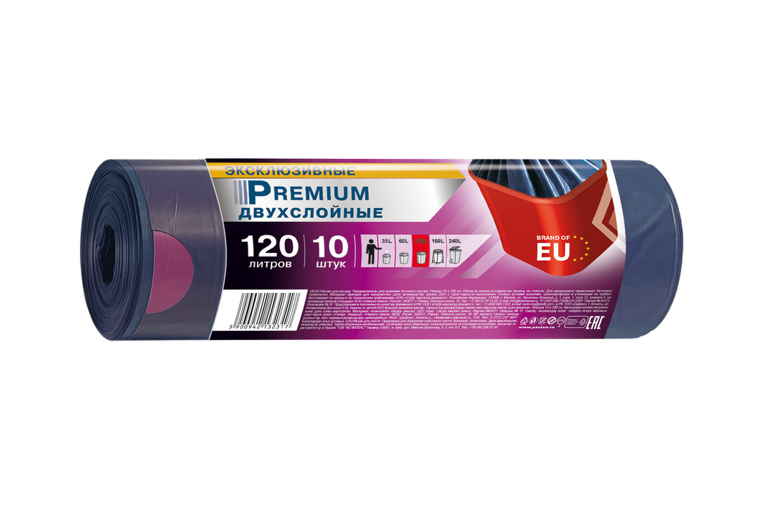Paclan PREMIUM Мешки для мусора с тесьмой ПВД 120 л. 10 шт. в рулоне