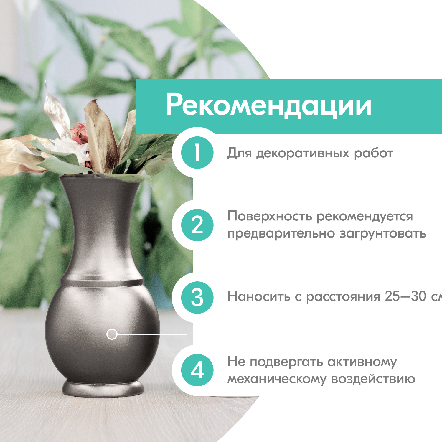 Отличная эмаль, равномерное нанесение, спрей. Универсальная. Недостатки: Красить только на улице или в подъезде. Так как разлетаются серебристые частички на большое расстояние вокруг, и помещение покроется серебристым налетом. Даже паперкрафт-картон покрасили. |