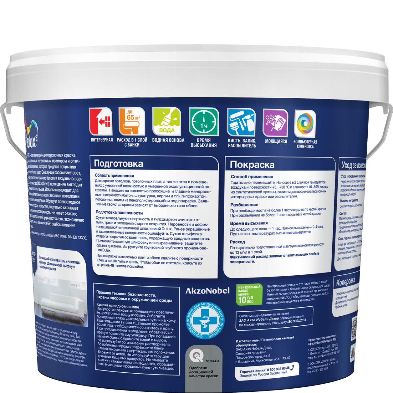 DULUX 3D White база BW белая краска в/д для потолков и стен матовая (9л) / DULUX 3D White base BW краска ослепительно белая для потолков и стен матова