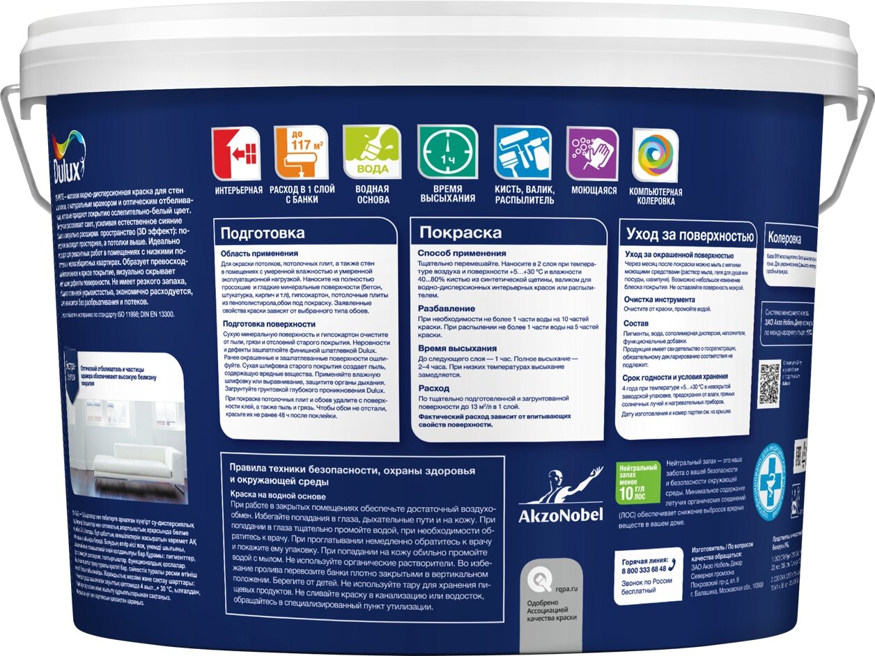 DULUX 3D White база BW белая краска в/д для потолков и стен матовая (9л) / DULUX 3D White base BW краска ослепительно белая для потолков и стен матова