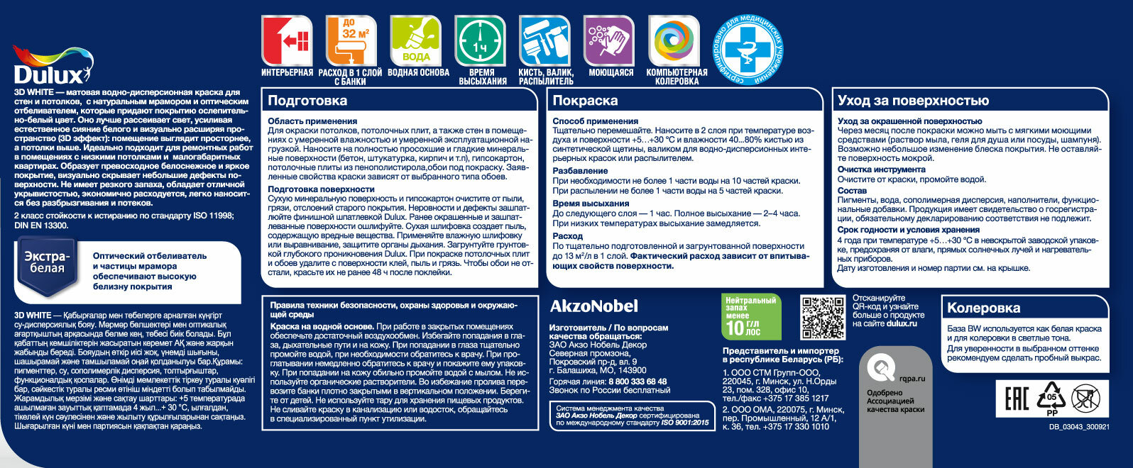 DULUX 3D White база BW белая краска в/д для потолков и стен матовая (9л) / DULUX 3D White base BW краска ослепительно белая для потолков и стен матова
