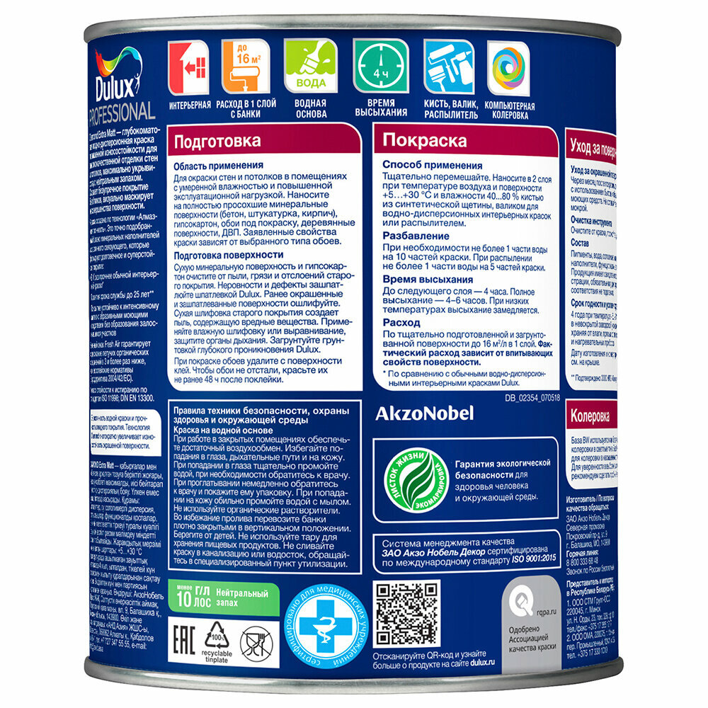 Краска DULUX PROFESSIONAL DIAMOND EXTRA MATT BW глубокоматовая 4,5 л (NEW)