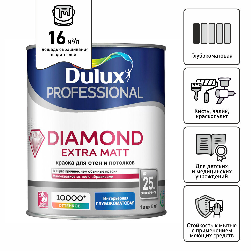 Dulux Diamond Extra Matt Краска для стен и потолков износостойкая (белая, глубокоматовая, база BW, 1 л)