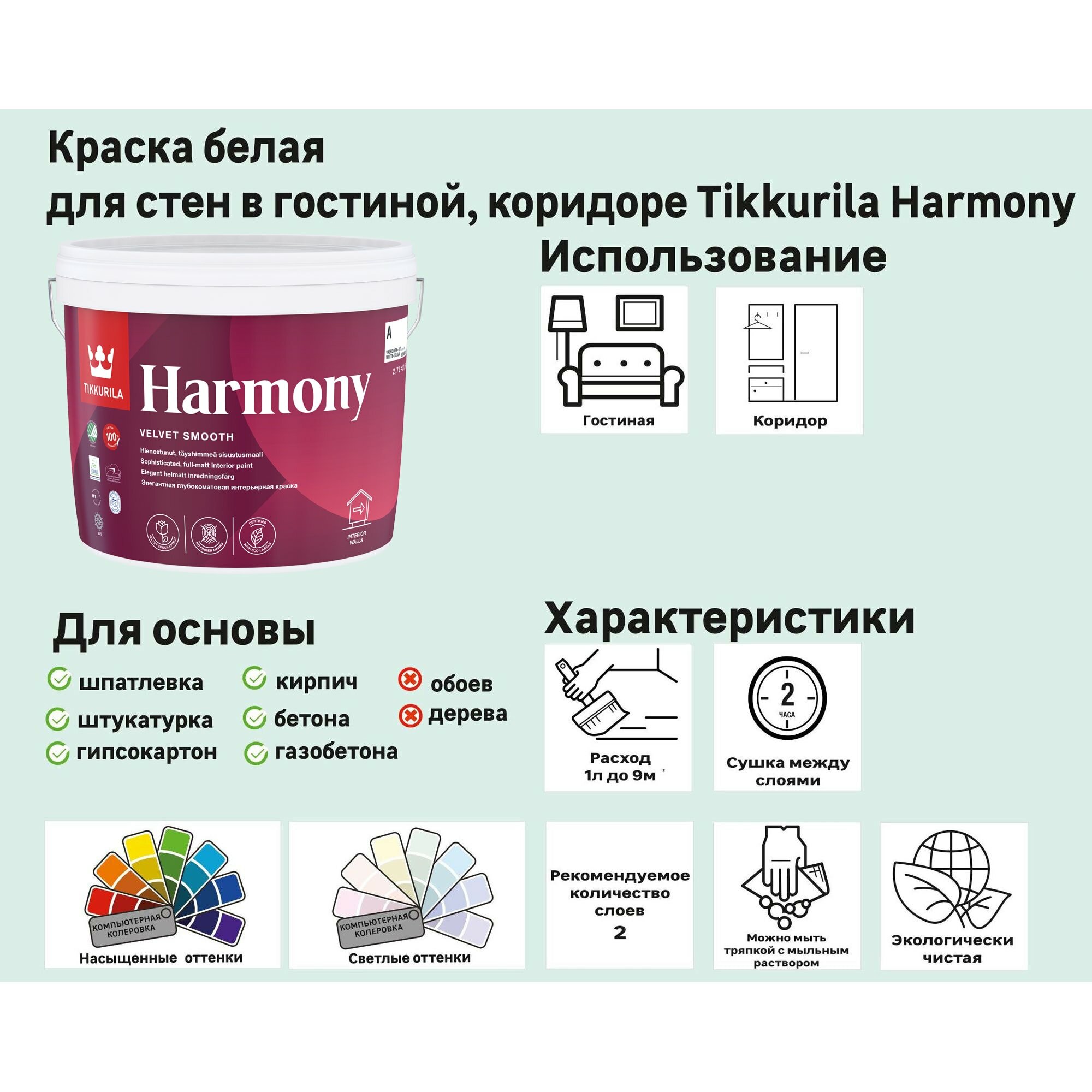 Tikkurila Harmony,Интерьерная глубокоматовая экологичная краска, придающая поверхности бархатистый эффект,база А, 9л