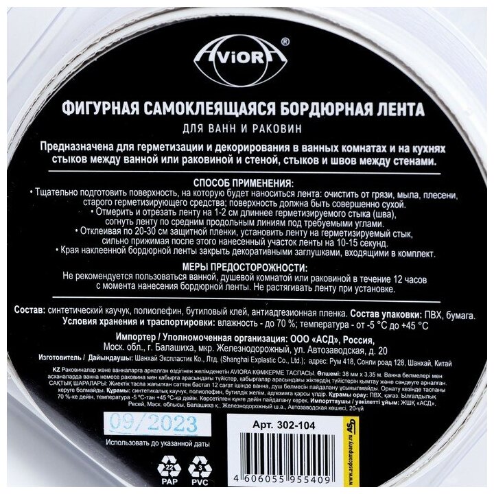 Бордюрная клейкая лента для ванн и раковин, 38 мм х 3,35 м, фигурная, AVIORA