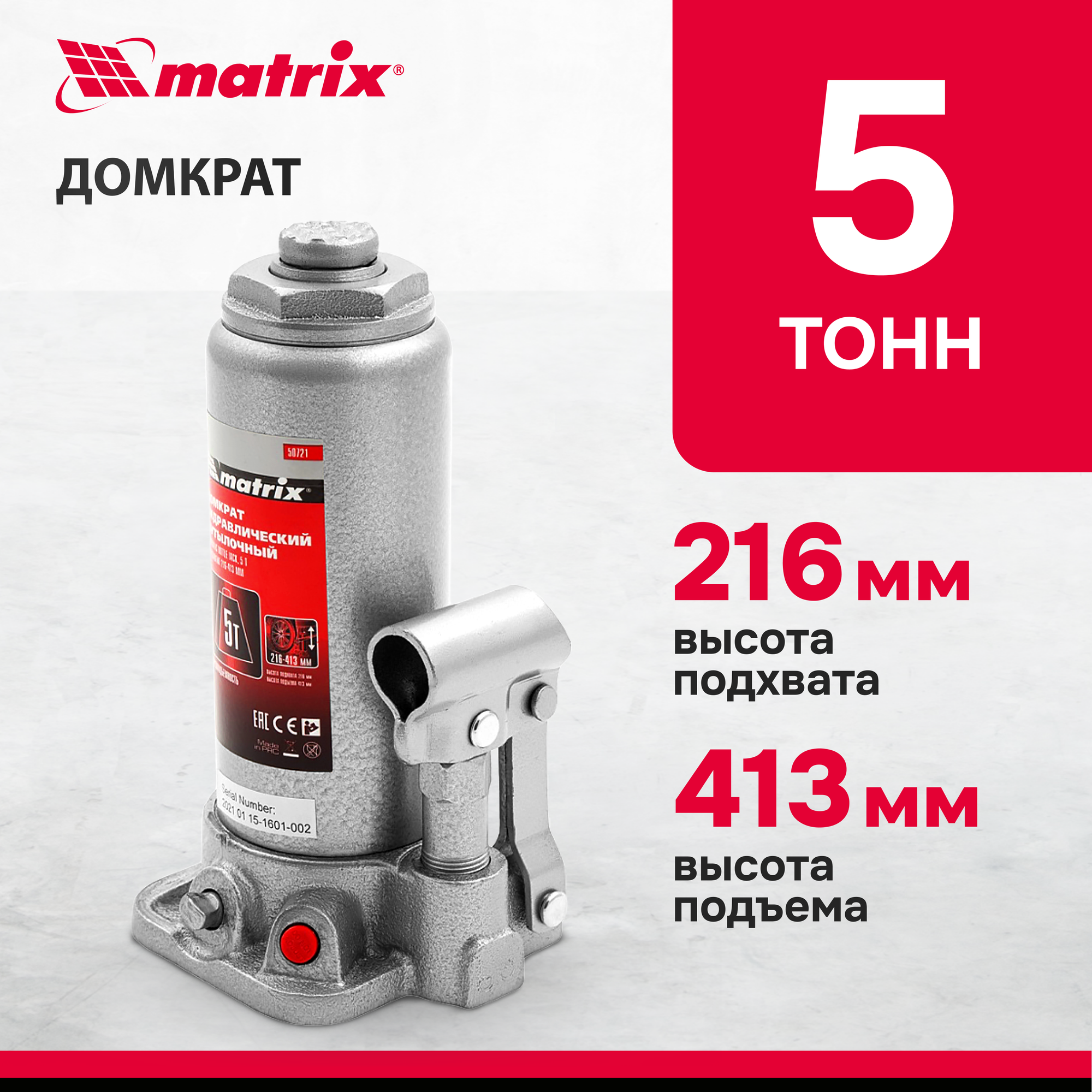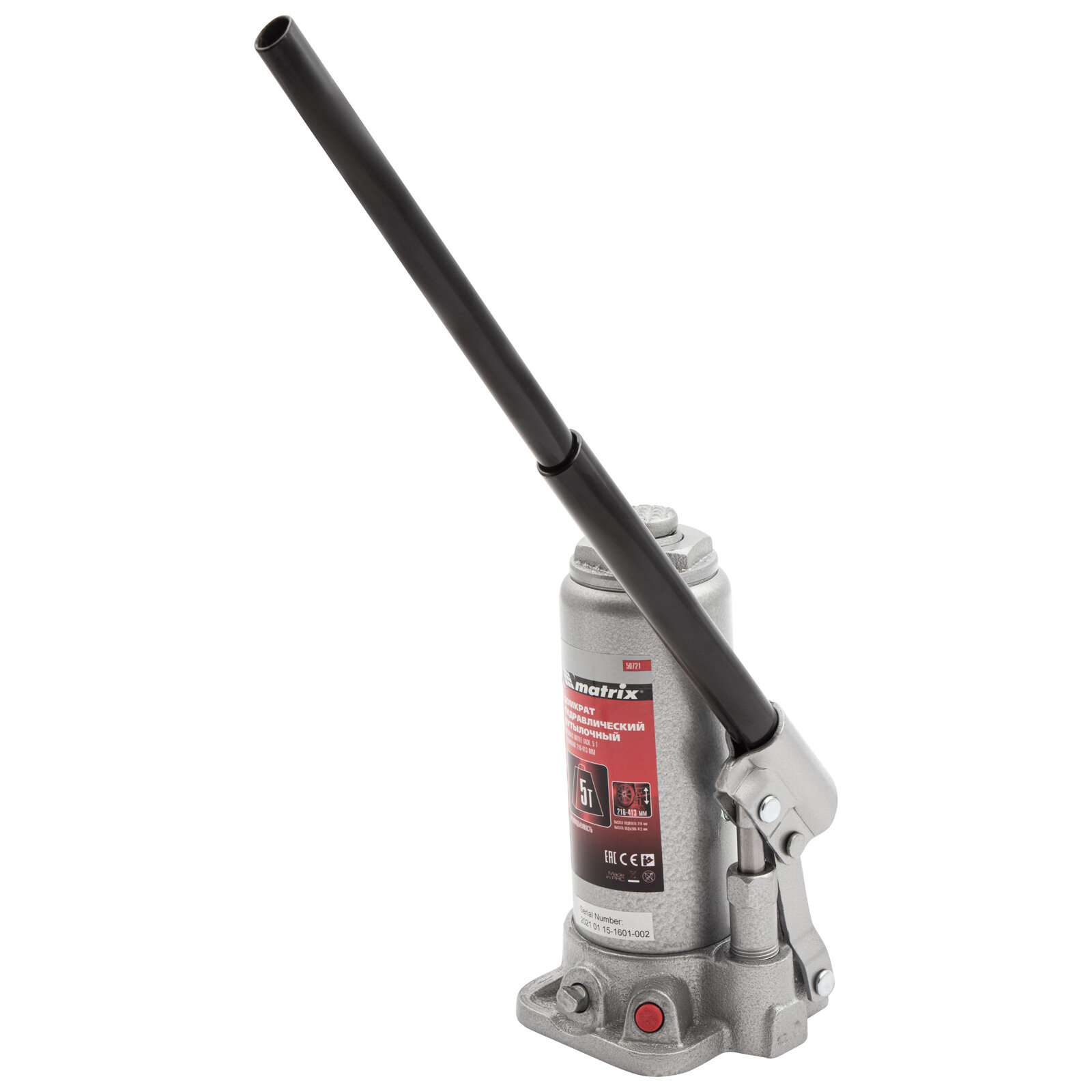 MATRIX Домкрат гидравлический бутылочный, 5 т, высота подъема 216-413 мм MATRIX Master 50721 MATRIX 50721 1шт