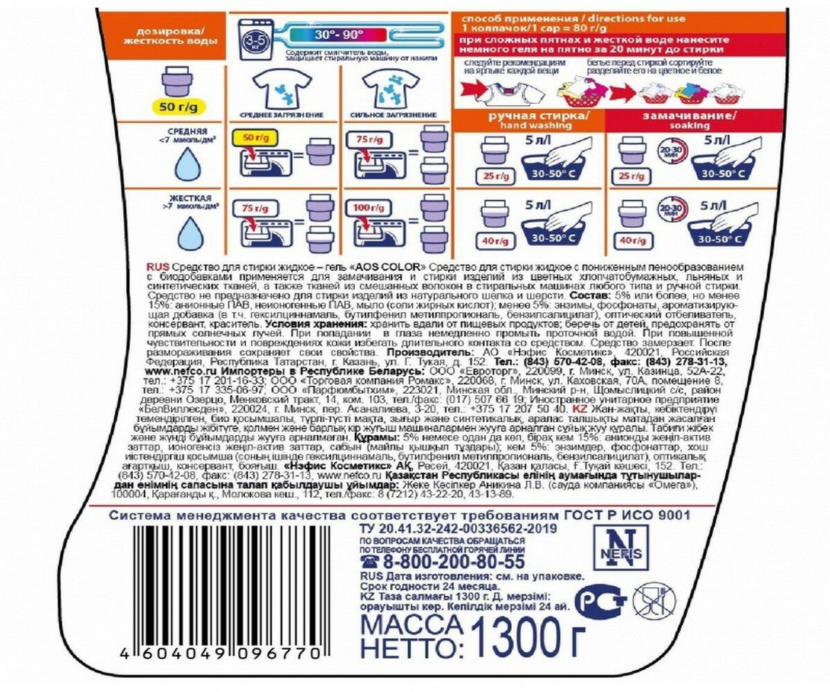 Гель в канистре яркого оранжевого цвета с удобной ручкой. Вес 1300 граммов. Концентрированный. Есть схема сколько наливать в колпачок, информация на двух языках. В гелях других производителей надо смотреть для ручной стирки или автоматической. У AOS химическая формула гели подойдёт для любой стирки. Для стирки взяла бабушкину яркую линяющую летнюю блузку в павлинах. Размер очень большой, поэтому покупаем по 2 одинаковых парео и сами шьём. Дёшево в меру ярко. Самое интересное. Всегда линяло, а с этим гелем нет. Да, ещё пахнет приятно и удаляет запах немолодого тела (стирала вещи пожилых родственников). Вещи после стирки чистые. Я не знала, что такое возможно в принципе. Двумя руками рекомендую. |