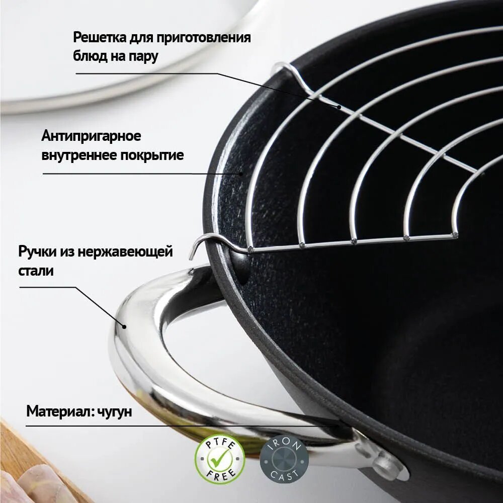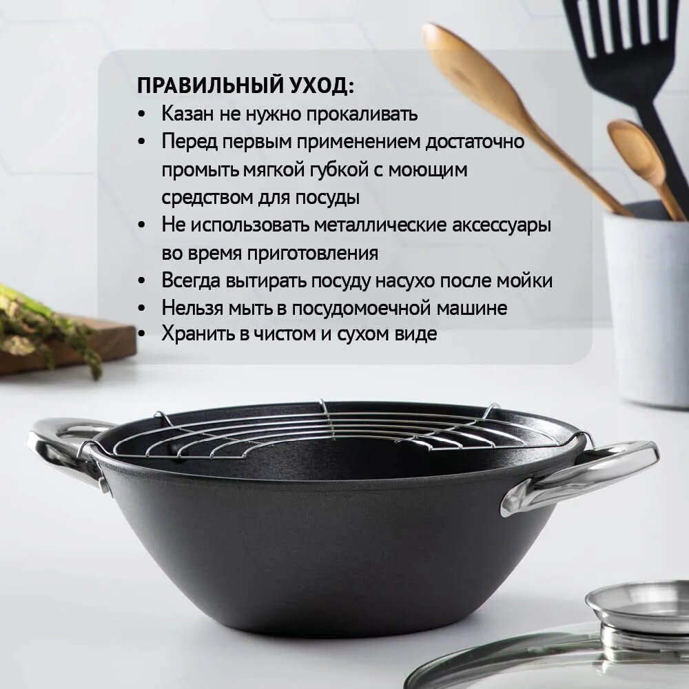 Казан 3,6л 28см (чугун) аП нержавеющая сталь/руч, решетка, стекляная крышка, нейл.лопатка, бамб.пал. Satoshi