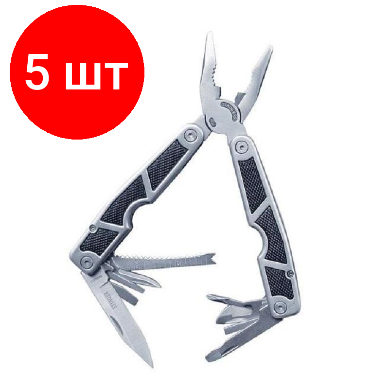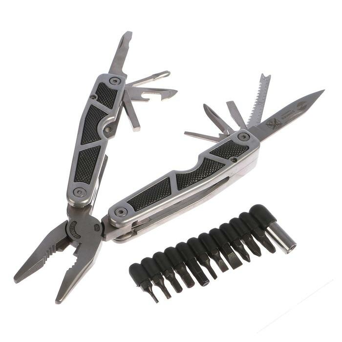 Мультитул Stinger, 10 функций, нержавеющая сталь/алюминий/каучук, серебристо-чёрный, в комплекте 12 насадок и нейлоновый чехол (MT-3011BK)