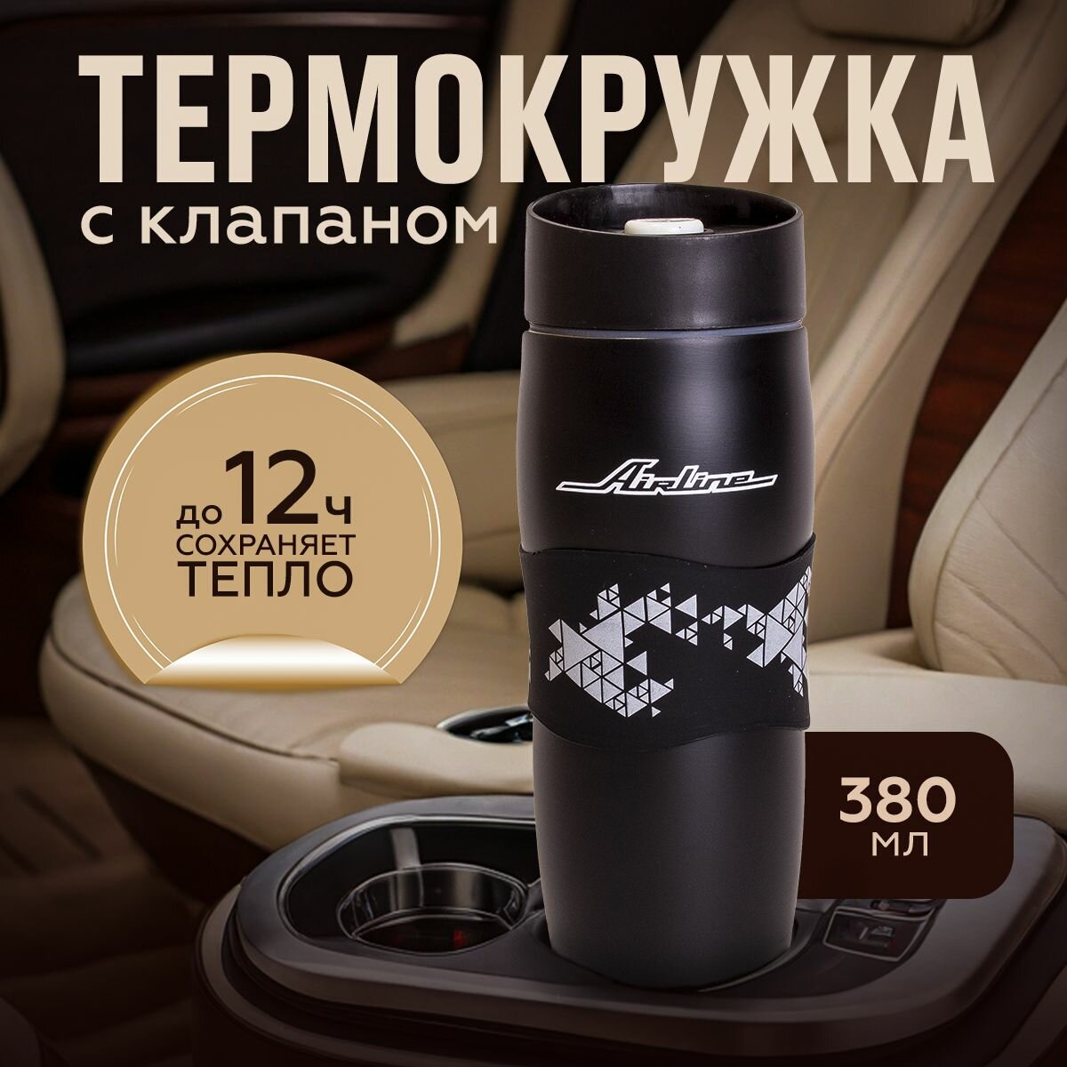 Термокружка непроливайка AIRLINE с клапаном, с резиновым настаканником, черная, 380 мл