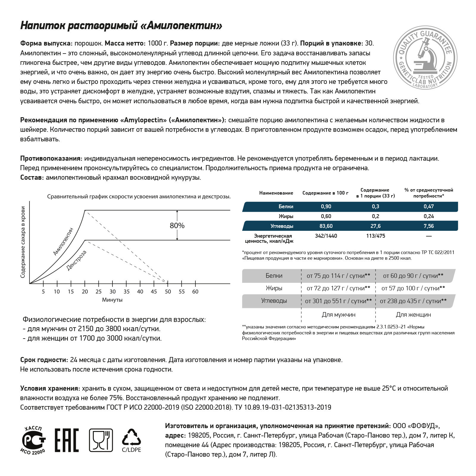 Амилопектин Geneticlab Nutrition 1000 грамм нейтральный без вкуса AMYLOPECTIN сложный углевод гейнер