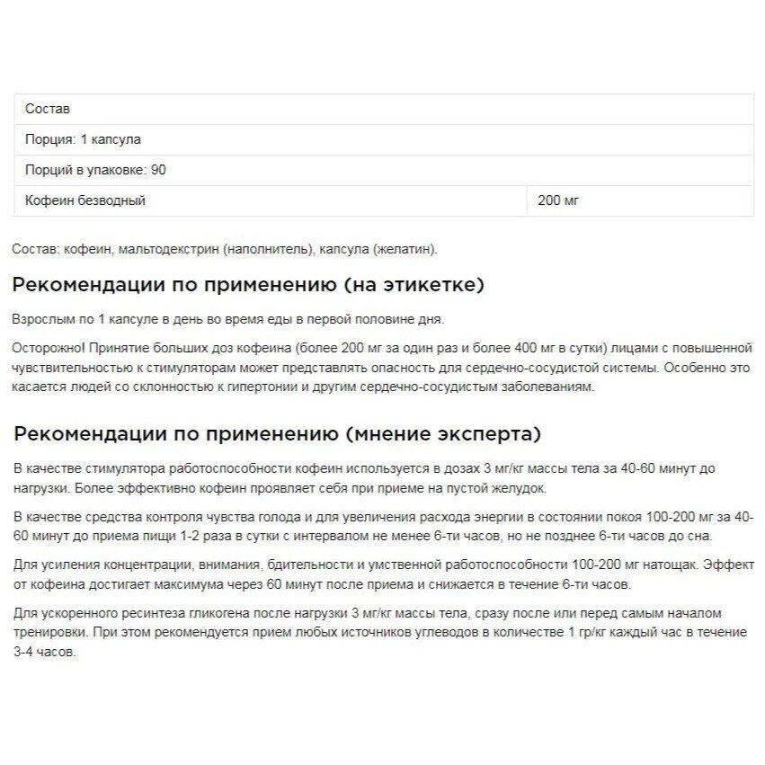 Кофеин в капсулах действует мягко и постепенно, придаёт энергии и бодрости. Настроение улучшается; появляется желание идти в зал. Капсулы нормального размера; я их легко пью, просто брать с собой, что не скажешь об обычном кофе. |