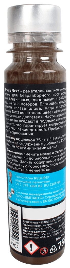 4304 Реметаллизант Resurs Next, 75г Пласт.Флакон (20шт/Кор) ВМПАВТО арт. 4304