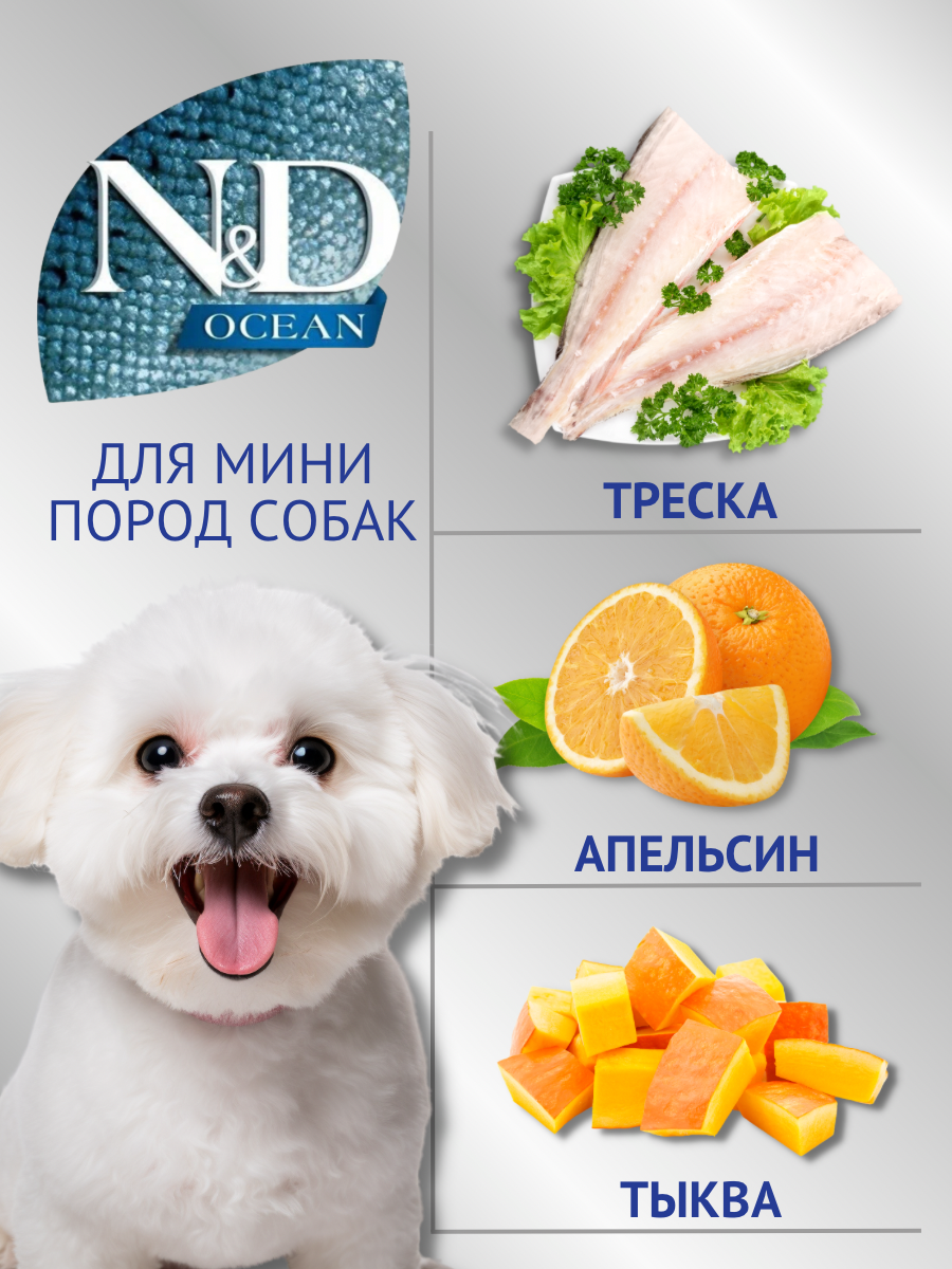 Сухой корм Farmina N&D Ocean для взрослых, пожилых собак маленьких мелких мини пород, Фармина НД беззерновой рацион со вкусом трески, тыквы и апельсина, 7кг