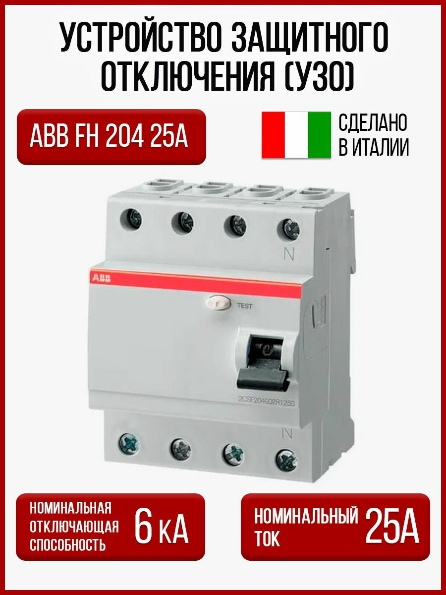 Устройство защитного отключения (УЗО) ABB FH200, 4 полюса, 25A, 30 mA, тип AC, электро-механическое, ширина 4 DIN-модуля