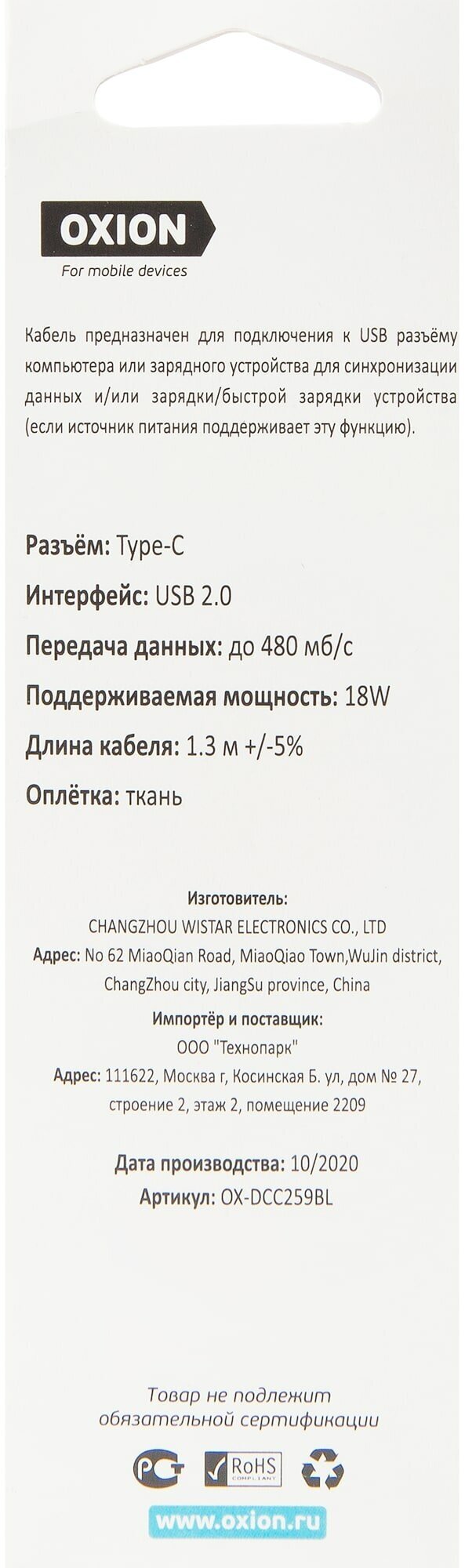 Дата-кабель Oxion DCC028 Type-C цвет синий