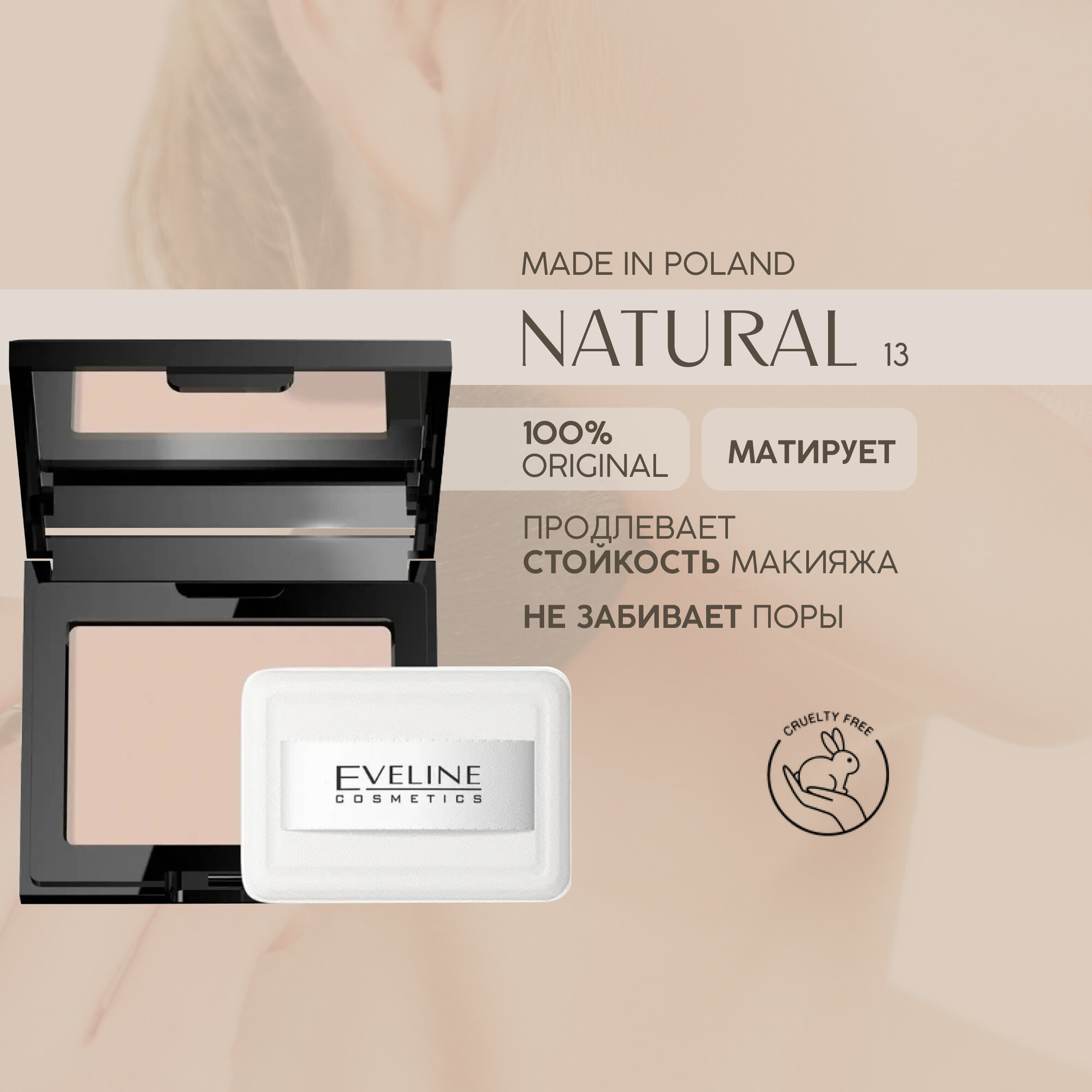 Пудра для лица EVELINE BEAUTY LINE бархатистая компактная №13 NATURAL, 9 гр