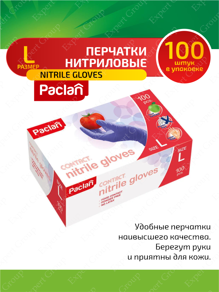 Перчатки одноразовые нитриловые Paclan Contact, размер L, фиолетовые, 50 пар в картон. коробке (136222)