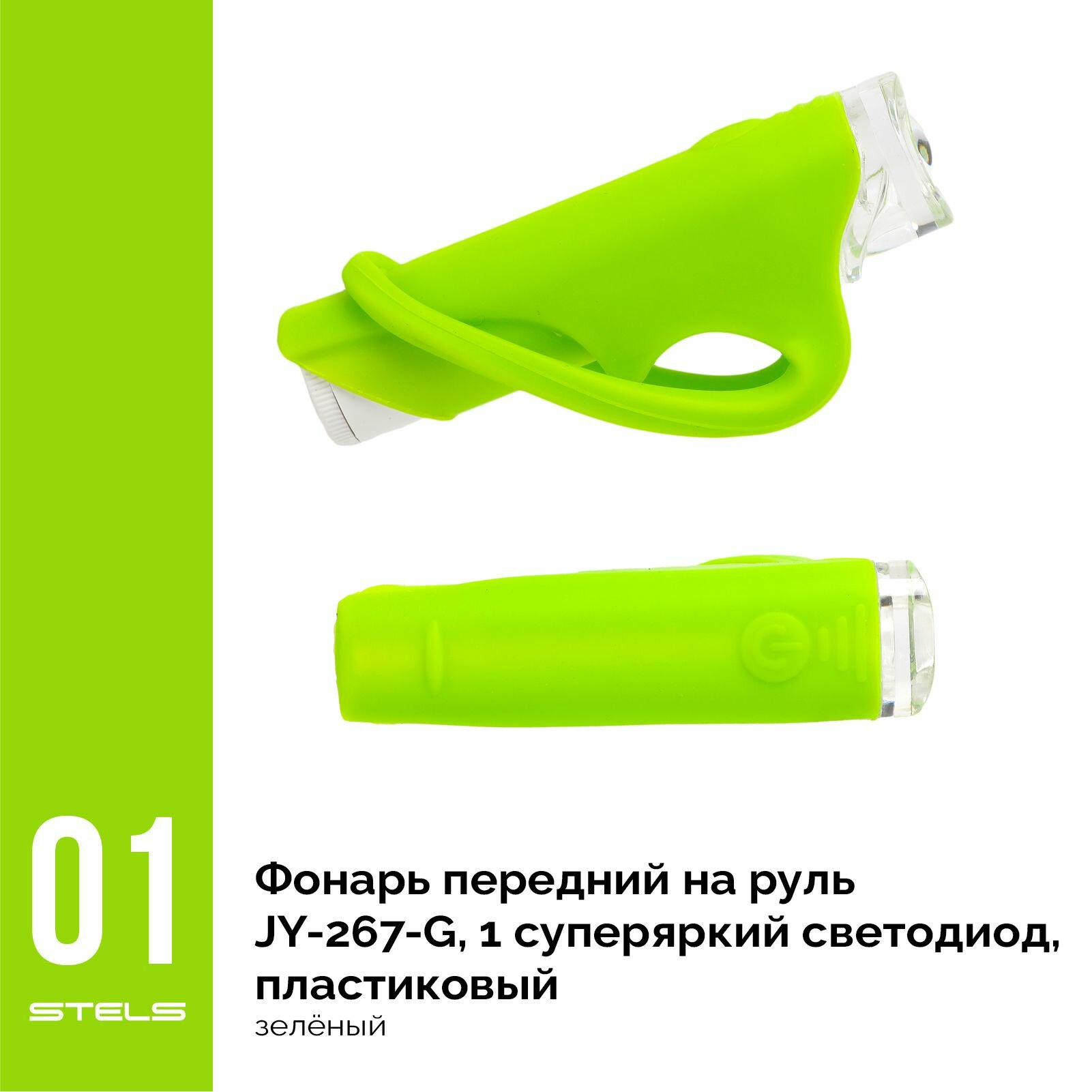 Фонарь передний STELS JY-267-G на руль, 1 суперяркий светодиод, пластиковый зелёный NEW