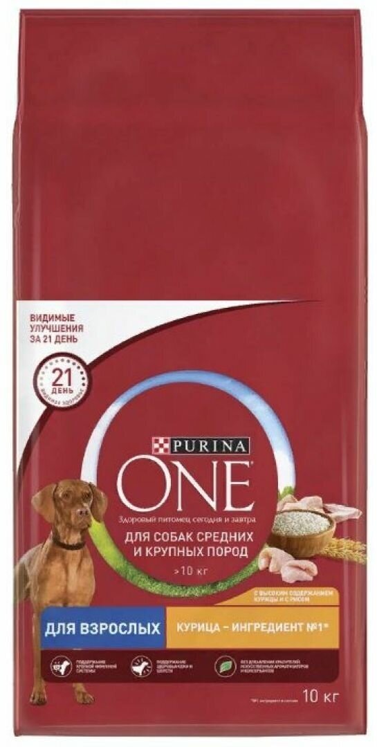 PURINA ONE 10 кг сухой корм для взрослых собак средних и крупных пород, с высоким содержанием курицы и с рисом
