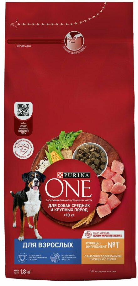 PURINA ONE 1,8 кг сухой корм для взрослых собак средних и крупных пород, с высоким содержанием курицы и с рисом
