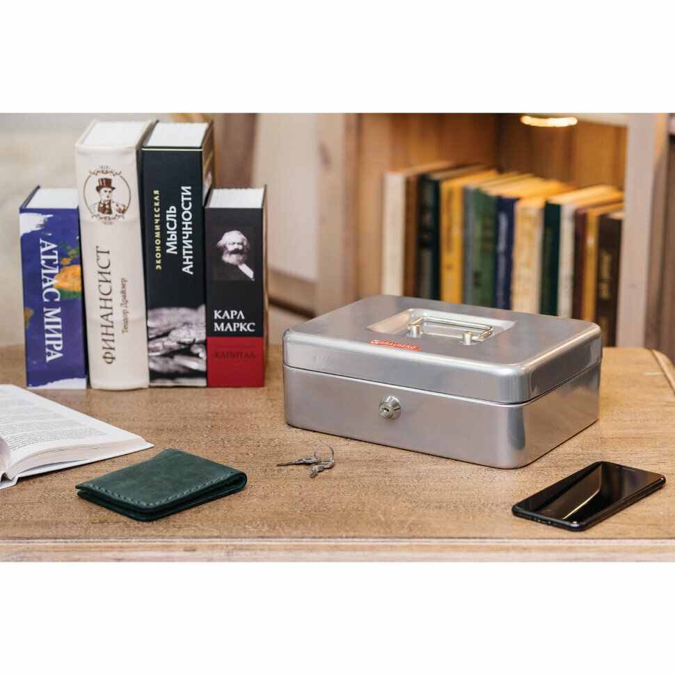 Ящик для денег, ценностей, документов, печатей, 90х180х250 мм, ключевой замок, серебристый, Brauberg, 291059